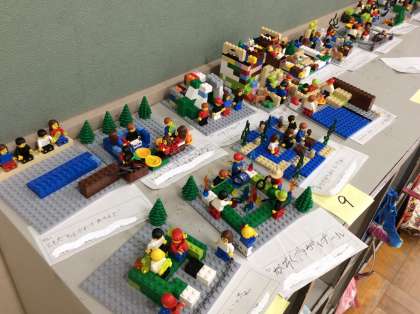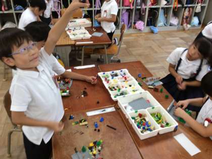 1年生はレゴエデュケーションのストーリースターターを使って、夏休みの思い出を表現しました。「うみであそんだよ」「ともだちと川へいったよ」「かぞくでキャンプをしたよ」など、それぞれの夏休みの思い出をレゴを組み合わせて、友だちにお話することができました。
