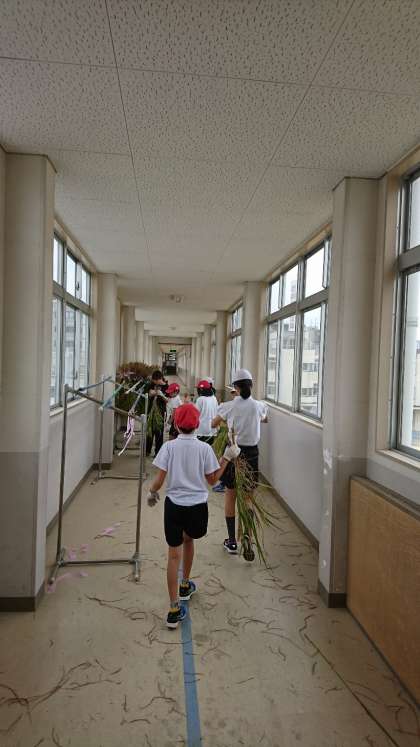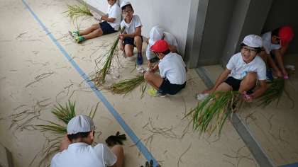 苗代田で育てていた稲も、稲穂がたわわに実りようやく収穫時期になりました。担任から、稲の刈り方を聞いて、子どもたちは安全に稲を刈っていました。今後、自分たちで育てた稲を精米して家庭科で調理して食べる予定です。さて、お米の味は?楽しみです。