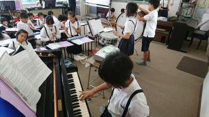 4年生は音楽の合奏で「となりのトトロ」を練習してしています。さまざまな楽器を使って、友だちと音を合わせることがとてもうれしいようで、子どもたちは音楽の時間を楽しみにしています。