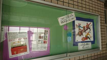 講堂前の掲示板には、大阪市内の美術館から配られるポスターを使って、子どもが作品から感じたことを掲載するスペースを作っています。今掲示しているのは、ギターを弾いている人が3人いる(実際は立体作品ですが、ポスターでは平面になっています)ポスターです。「題名をつけてみよう」と投げかけると、ちょうど2年生で「鑑賞した音楽から物語をつくってみよう」という授業を行っていたらしく、2年生の子どもたちが題名を考えてくれました。教室で学んだことの広がりを感じました。