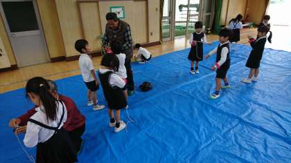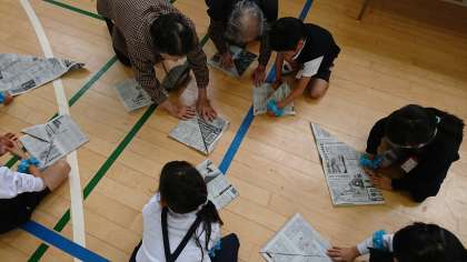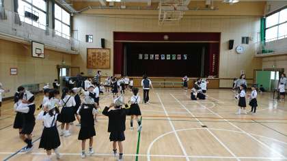 1年生は、地域の方を招いて、昔の遊びを教えてもらいました。折り紙、けん玉、だるま落とし、お手玉、コマ回しとそれぞれの場所に分かれて遊び、子どもたちはとても楽しんだようです。