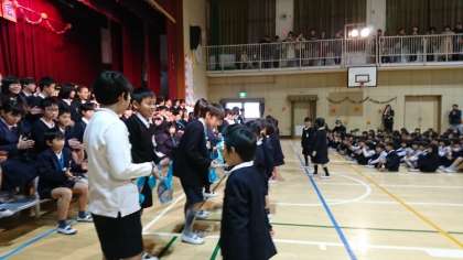 6年生は、1年生からはありがとうの気持ちがいっぱいこもったメダルをもらいました。各学年が6年生との思い出を呼びかけた後、合唱、合奏を披露してくれました。