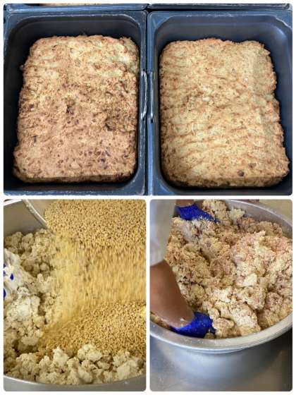 とうふローフは、ツナ、とうふ、細かくカットした大豆、たまねぎ、でん粉を混ぜ合わせ、砂糖、塩、こいくちしょうゆで味付けし、焼き物機で焼いています。
