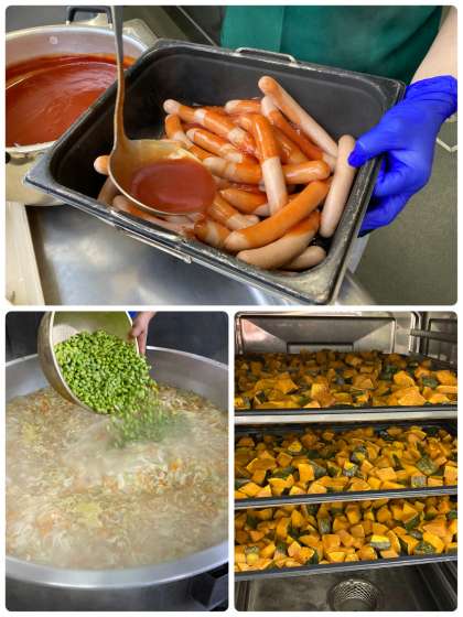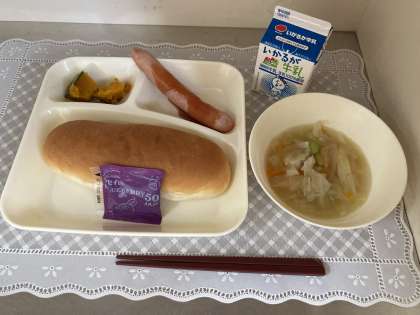 今日の給食は、児童に人気の「ウインナーのケチャップソース」。パンにはさんで「ホットドック」にして笑顔で食べていました。