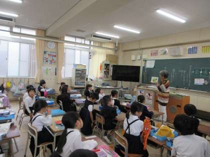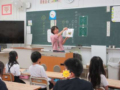 今日は英語の絵本の読み聞かせです。低学年の子どもたちにもわかるように、カラフルな絵柄の絵本をリズムよく読んでくださり子どもたちも興味津々でした。