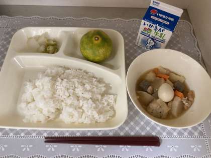 今日の給食では、鶏肉、うずら卵、ごぼう平天、じゃがいも、こんにゃく、あつあげ、だいこん、にんじんが使われています。