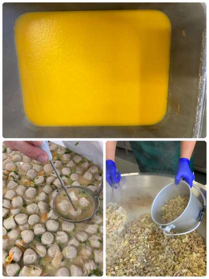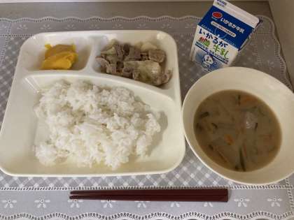 今日の給食は、いわしだんごとだいこん、ごぼう、にんじん、青ねぎなどが入ったものです。いわしだんごには、骨や歯をじょうぶにするカルシウムが含まれています。