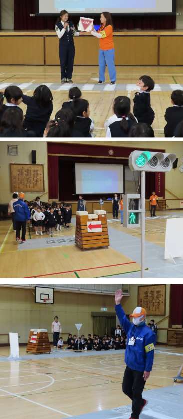 今日は、阿倍野警察や地域見守り隊の方に来ていただき、1年生と4年生に『交通安全指導』をしていただきました。