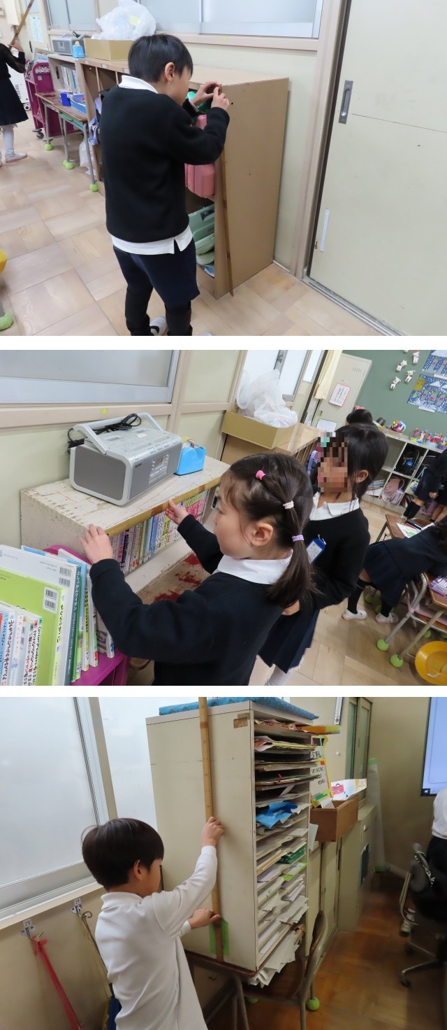 「1mを見つけよう」という問題で、1mさしを使って、教室の中で1mのものを探していました。