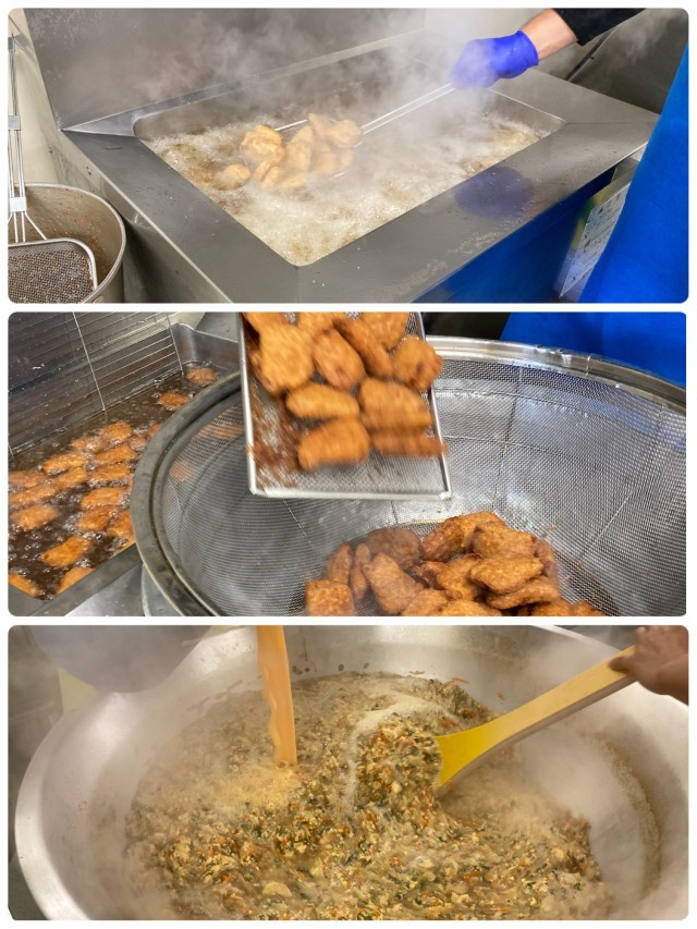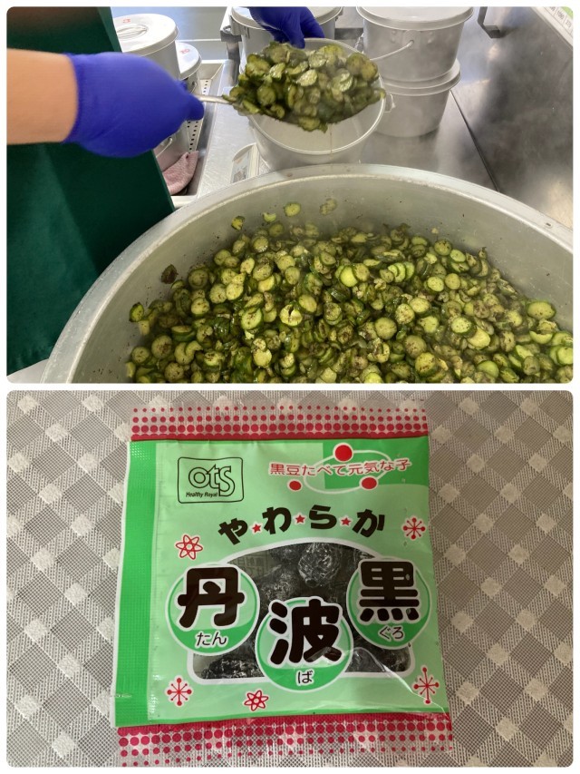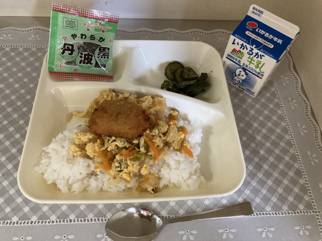 給食では、けずりぶしでとっただしで、たまねぎ、にんじん、青ねぎを煮て、調味料で味付けします。最後に卵を流し入れて作った具をご飯にかけ、さらにトンカツをのせて食べます。
