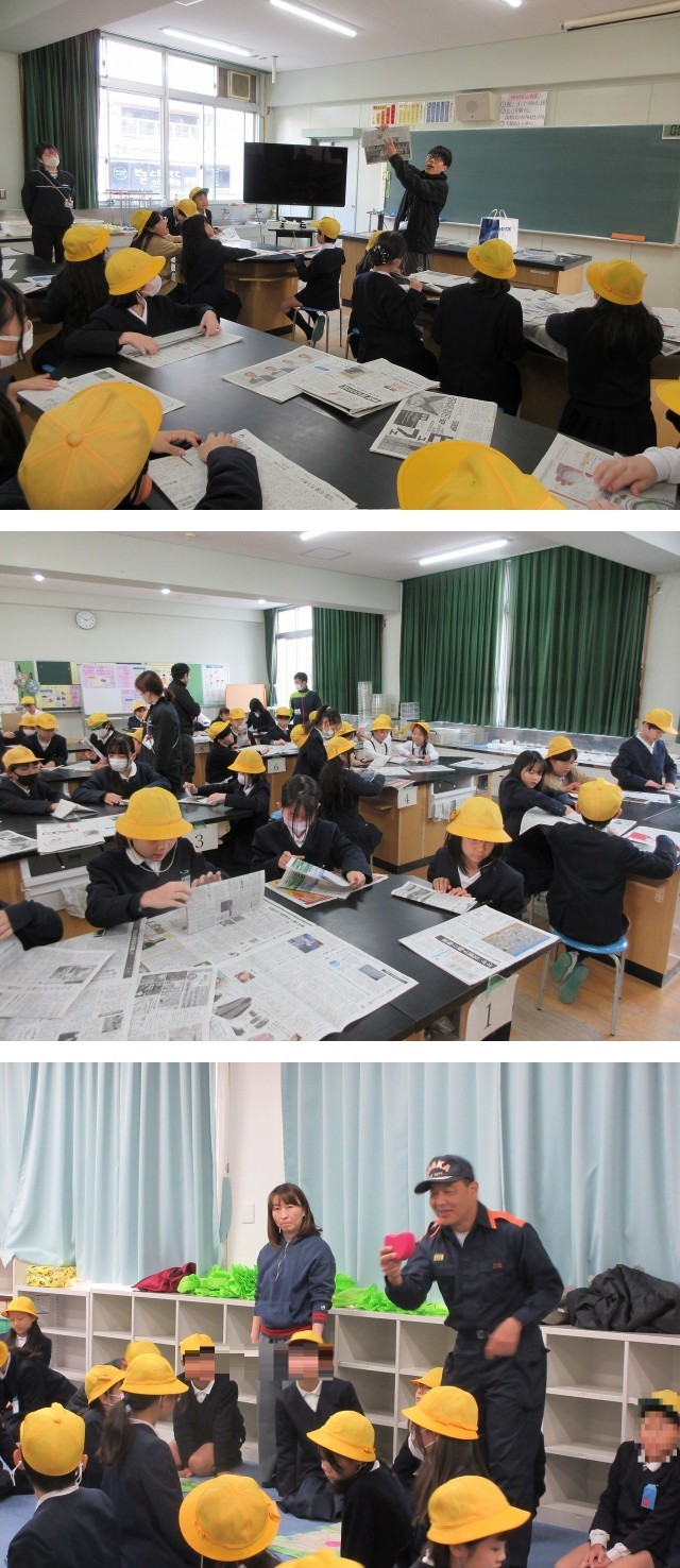 4年生は、水消火器による「消火体験」と「防災スリッパ」を新聞紙で作りました。