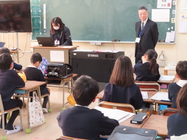 今日の全校朝会は、欠席者も多いことから2年生の教室から各教室に配信しました。