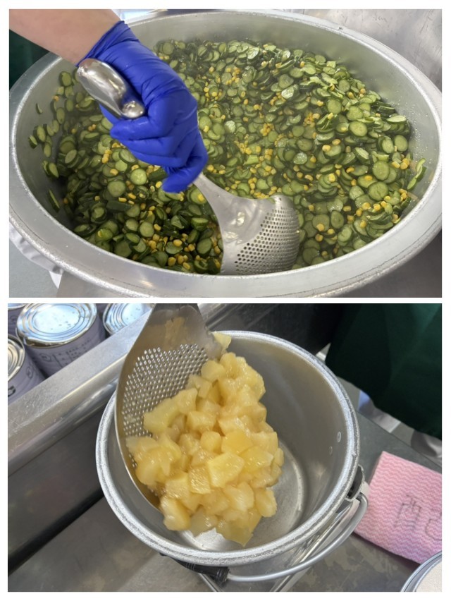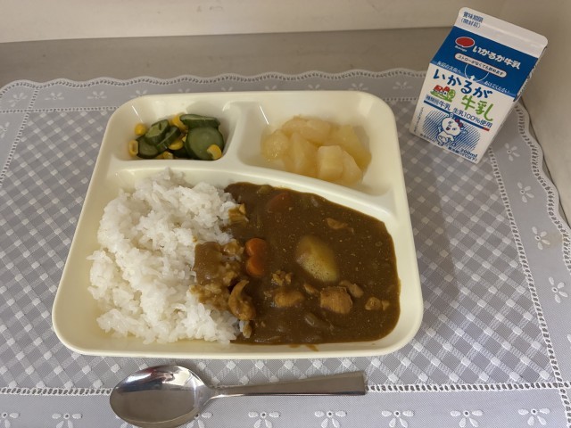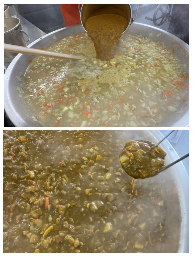 今日の給食では、チキンレバーカレーライスに鶏レバーのペーストを使っています。