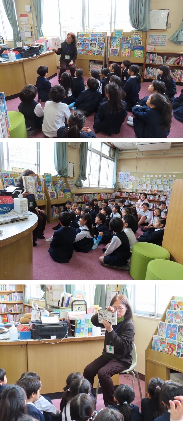 今日は、図書室で司書の先生から絵本を読んでもらっていました。