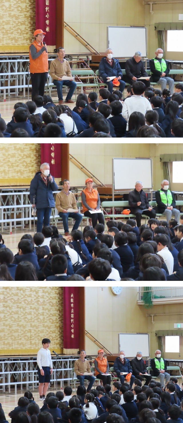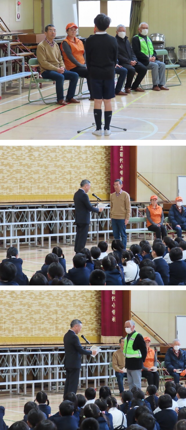 児童代表のあいさつのあと、感謝状を渡し、見守り隊の方から一言ずつあいさつをしていただきました。