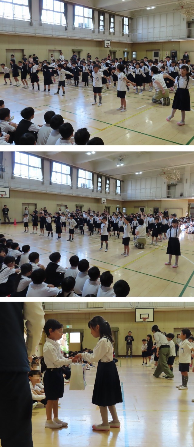 2年生が「お祝いの言葉」と歌を歌ってくれ、去年自分たちで育てた「アサガオの種」をプレゼントしました。