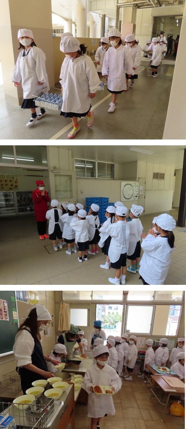 今週からは、1年生が給食室まで行って牛乳や食器を運ぶようになります。