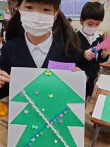 クリスマスツリーをつくっています。 ビーズやリボン等の装飾をし、素晴らしいツリー...
