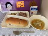 【今日の給食】 ・押麦のグラタン ・スープ ・デコポン ・コッペパン ・アプリ...