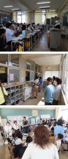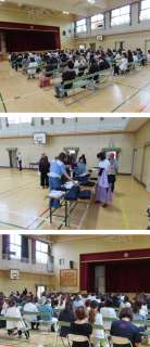 運動場では、今日もソフトボール投げをしていますが、講堂では、それ以外の学年が『...