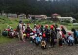 開舎式を終え、避難訓練をしました。雨も上がり、今から噴火口の登山です。ファイアー...