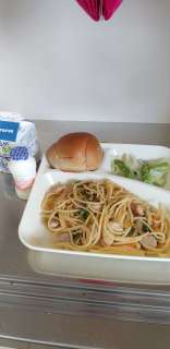 チキントマトスパゲッティ グリーンアスパラガスとキャベツのサラダ 発酵乳 パン ...