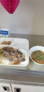 牛丼 とうがんのみそ汁 白花豆の煮もの ごはん 牛乳