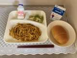 【今日の給食】 ・カレースパゲッティ ・グリーンアスパラガスとキャベツのサラダ...