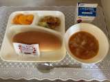 【今日の給食】 ・カレーマカロニグラタン ・トマトスープ ・みかん(缶) ・コ...