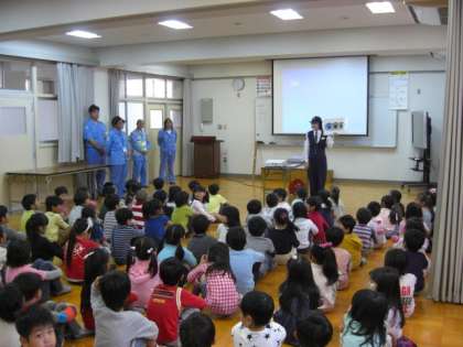 5月10日(金)交通安全指導を実施しました。阿倍野警察のお巡りさん、阿倍野区役所の安全サポーターの方々をお招きし、運動場で模擬道路を使い、1年と4年、2年と5年、3年と6年のペア学年で実施予定でした。しかし、天候が悪く、多目的室で、お巡りさんのお話と、交通安全ビデオを視聴しました。みんな真剣にお話を聞いていました。