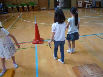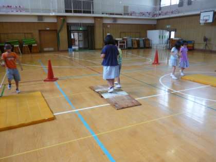 目隠しをして、簡単な坂道や段差を歩いてみました。