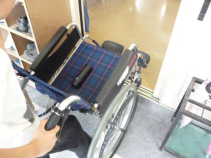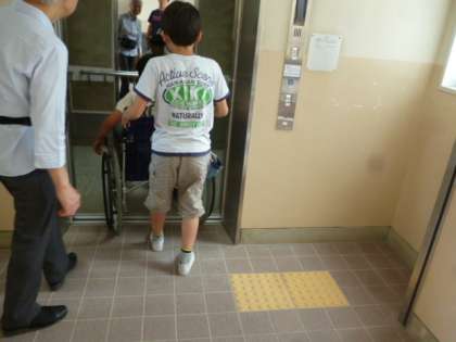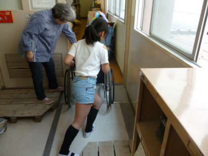 車いす体験では、教室とエレベーター、手洗い場、図工室を車いすで回りました。段差のあるところや机が並んでいるところでは、車いすが通りにくいことを実感していました。