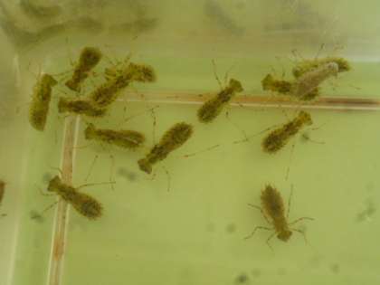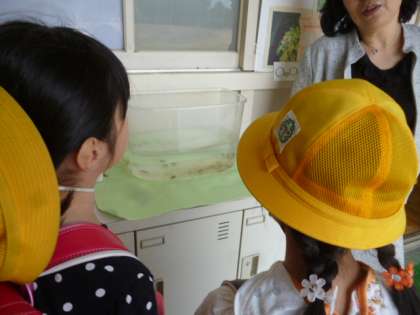月末から始めるプール学習にむけて、管理作業員さんがプール掃除を始めています。プールの水を抜いていると、「やご」がいっぱい取れました。