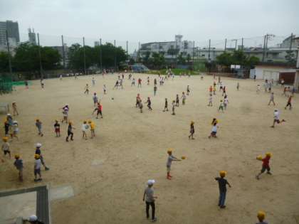 休み時間には、たくさんの児童が運動場に飛び出て、おにごっこをしたり、ボール投げをしたりしていました