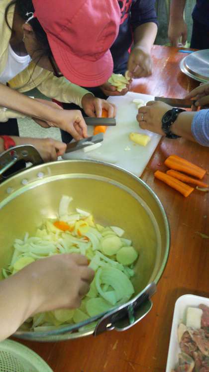 グループで役割をきめ、野菜を切ったり火起こしをしたりして、カレー作りに挑戦です。