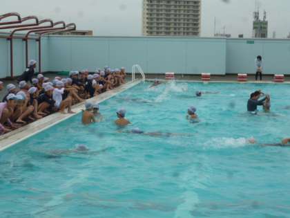 夏休みに伸ばした泳力を試したり、宝さがしなどのゲームをしたりして最後のプール学習に取り組んでいます。