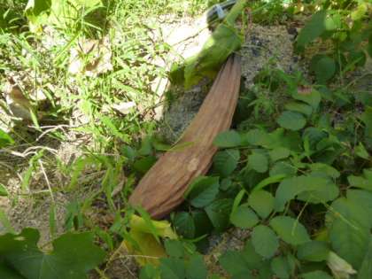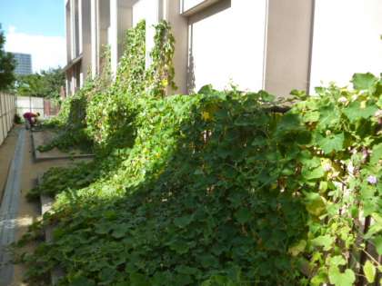 体育館裏の学習園に行くと、春に植えたヘチマやヒョウタンの葉やつるが大きく育ち生い茂っています。