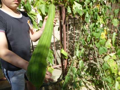 一人で持つには大きすぎるヘチマが何個もできていました。写真で大きさがわかっていただけると思います。