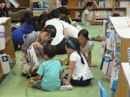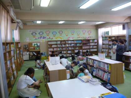今日は、PTA図書ボランティアの方々が集まり、一日図書館開放をしてくださいました。休み時間には、児童が集まり、読み聞かせをしたり、いっしょに本を探したりしてくださいました。