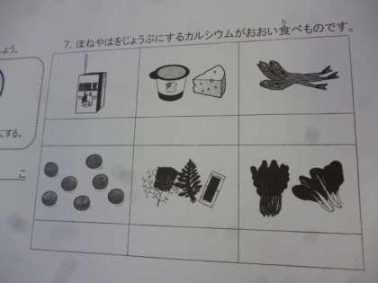 「骨や歯を丈夫にするには、カルシウムが必要である」「牛乳には、カルシウムがたくさん含まれている」「牛乳のほかにもカルシウムを多く含む食物があること」などを学びました。