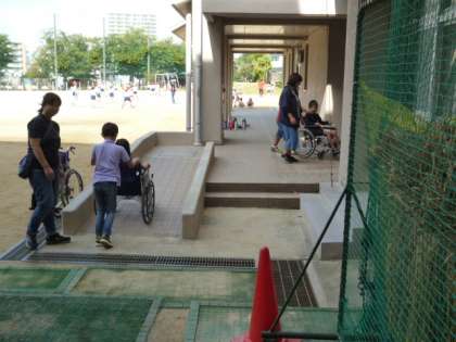 次に同じ道を車いすに乗って、一人で動かしてみました。自分の力だけではまっすぐ進むのは難しく、悪戦苦闘している児童がいました。押してもらうと助かることを実感したようです。
