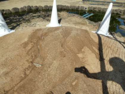 その後築山近くの土が盛り上がったところで水を流し、川の内側と外側の流れのちがいついて学習しました。