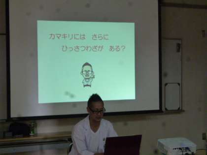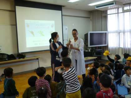 「みんなに虫を大好きになってほしい」と虫についていろいろ楽しいお話をしてくれました。虫が好きな子ども、苦手な子ども、みんなが盛り上がっていました。楽しい雰囲気の中学習は進み、学習の終わりには、虫が苦手な子どもも平気になるほどになっていました。