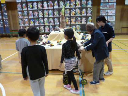 3年生は、総合的な学習で訪問させていただいた方々に招待状を送っていました。その招待状を見て、「エイジフリー」の方々が子どもたちの作品を見に来てくださいました。子どもたちは大喜びで、一生懸命説明をしていました。
