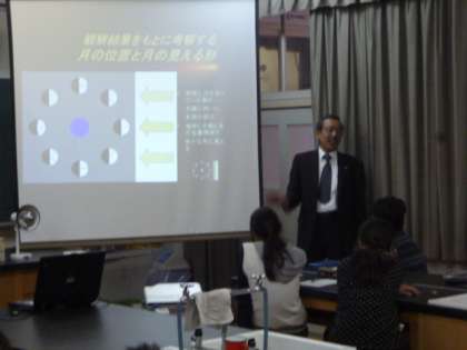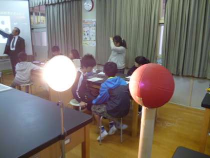 「月と太陽」の学習で、月が満ち欠けして見える訳をライトを太陽、ドッジボールを月に見立てて観察しました。また、太陽や、月、火星等の表面の映像を解説を交えながら見せていただきました。