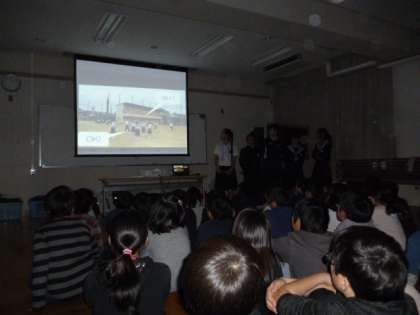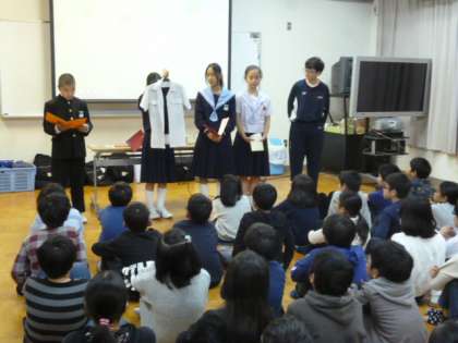 阪南中学校の生徒会の生徒が小学校に来て、5年生に中学校生活についての説明をしてくれました。一日の学校の流れや部活動、校則など、スクリーンを使って分かりやすく説明してくれました。