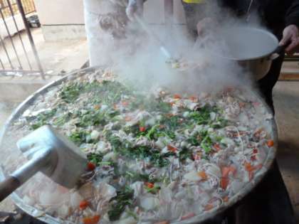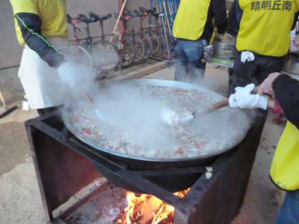 子どもたちが講堂で楽しんでいる間に、講堂の外では、恒例の豚汁づくりをしました。大きなおなべでぐつぐつ煮込み、おいしそうにできあがりました。
