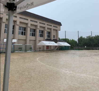 運動場のテント、例年なら運動会練習時に使用していますが、今年はもっぱら日除け用、雨宿り用となっています。