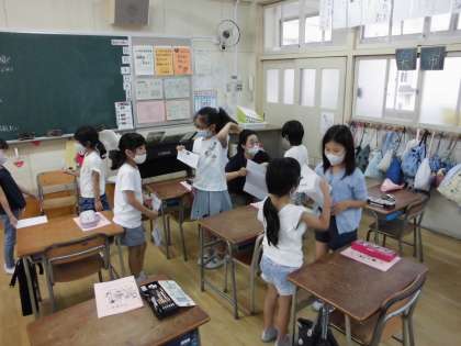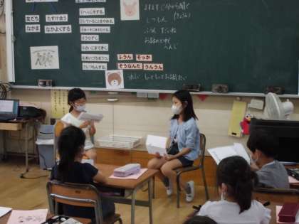 今日は夏休みの思い出ベスト3について、ウサギさん役とくまさん役となり、お互いがパートナーの話に耳を傾け合って気持ちよく会話する体験活動をしました。