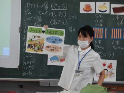 栄養教諭の先生にお越しいただき「おやつについて考えよう」という授業を行いました。